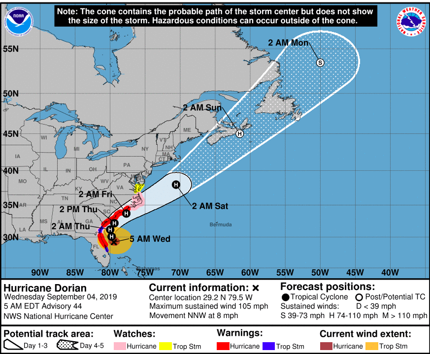 “Dorian is moving slowly north-northwestward to northwestward … There is basically no change to the track forecast reasoning. Over the next day or so, the hurricane is forecast to gradually turn toward the north as it moves through a break in the subtropical ridge,” according to the NHC.